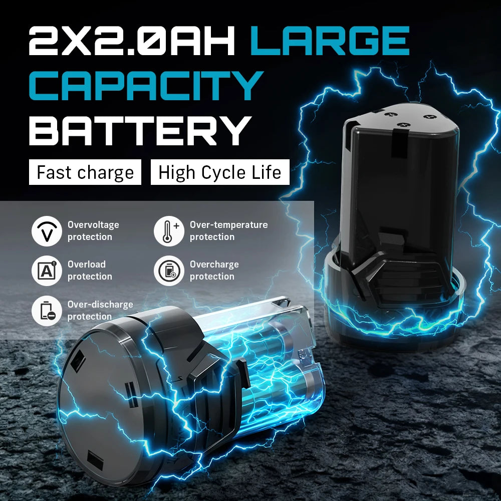 - Two 12V 2000 mAh batteries let you work for about four hours of continuous use on a full charge, with quick swaps to minimize downtime.